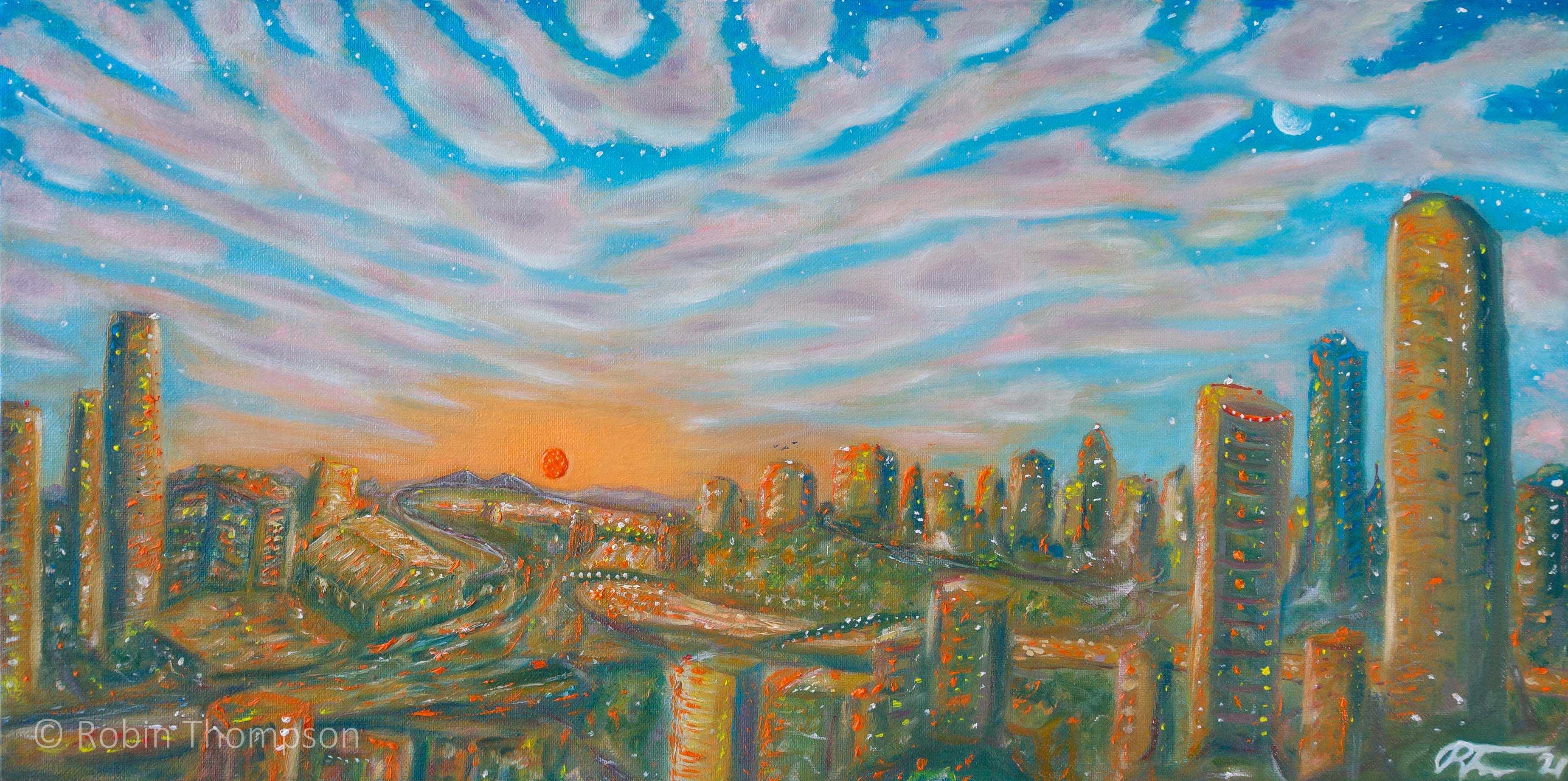 A view of Melbourne/Naarm from Southbank. I always love when the sky puts on a show for us at that golden sunset hour, and wanted to capture that on canvas.